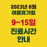 여름휴가철 8월 10~15일까지 진료시간 변경 및 일부 휴진 안내해 드립니다. 8월 9일 (수) 오전 8시 30분~오후1시 8월 10일 (목) 오전 8시 30분~오후1시 8월 11일 (금) 오후2시~오후7시 8월 12일 (토) 오후2시~오후4...