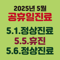 2025년 5월 공휴일 진료 일정 안내 5월 1일(목) 및 6일(화) 정상진료 5일(월) 어린이날 휴진합니다. 건강한 가정의달 보내세요.