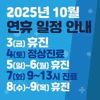 2025년 10월 추석 기간 진료일정 안내해 드립니다. 10월 3일(금요일) 휴진 10월 4일(토요일) 정상진료 10월 5일(일)~6일(월) 휴진 10월 7(화) 09~13시 진료 10월 8일(수)~9일(목) 휴진 행복하고 건강한 연휴 보내세요!